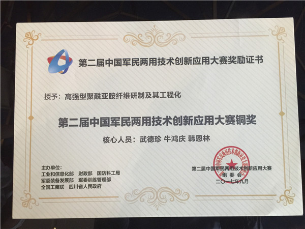 9月26日~29日,“第二屆中國(guó)軍民兩用技術(shù)創(chuàng)新應(yīng)用大賽決賽”在成都舉行,江蘇先諾新材料科技有限公司在武德珍董事長(zhǎng)的帶領(lǐng)下,以半決賽小組*的名次晉級(jí)決賽,并取得創(chuàng)新組銅獎(jiǎng)的優(yōu)異成績(jī)。通過(guò)本次大賽,公司的高強(qiáng)型聚酰亞胺纖維產(chǎn)品在軍民兩用技術(shù)領(lǐng)域的重要應(yīng)用得到了充分展示,并獲得了廣泛關(guān)注。